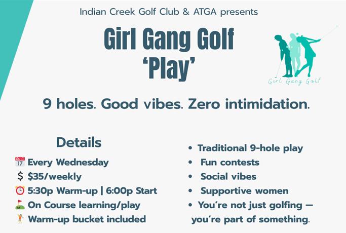 GGG Play: 9 Hole Social Round | Every Wednesday at 5:30pm | $35+ tax includes green fee, car fee, and warm-up bucket | On-course play and learning | Social vibes, no stress, fun golf with the ladies