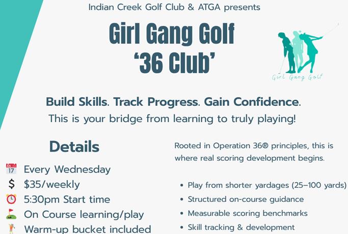 GGG 36 Club: Progressive Play | Every Wednesday at 5:30pm | $35+ tax includes green fee, car fee, and warm-up bucket | Op36 Teaching Framework | For players who have completed beginner lessons | Intro to on-course play from shorter yardages | Build confidence, learn course etiquette, improve scoring | Instruction from Director of Instruction - Angella Then