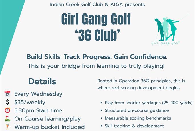 GGG 36 Club: Progressive Play | Every Wednesday at 5:30pm | $35+ tax includes green fee, car fee, and warm-up bucket | Op36 Teaching Framework | For players who have completed beginner lessons | Intro to on-course play from shorter yardages | Build confidence, learn course etiquette, improve scoring | Instruction from Director of Instruction - Angella Then