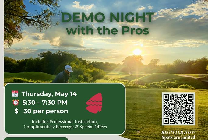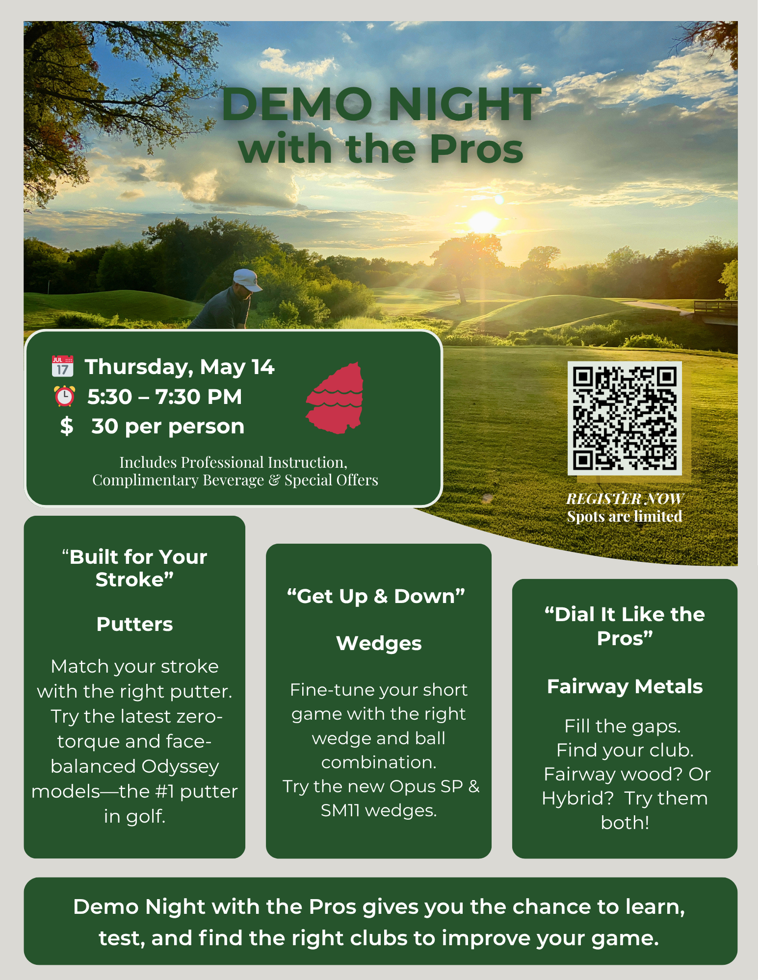 Thank you for registering for our Demo Night with the Pros - we will meet at the driving range starting at 5:30pm. Our professional staff will demonstrate the latest equipment and trends from Callaway and Titleist. Then we'll move to smaller groups for a rotation through full swing, chipping/ball fitting, and putting stations. These 30 minute sessions will provide you the knowledge and testing required to make informed decisions about your next equipment purchase. Call or Email Ryln or Chad if you have questions. This group will be limited to the first 15 golfers to register.